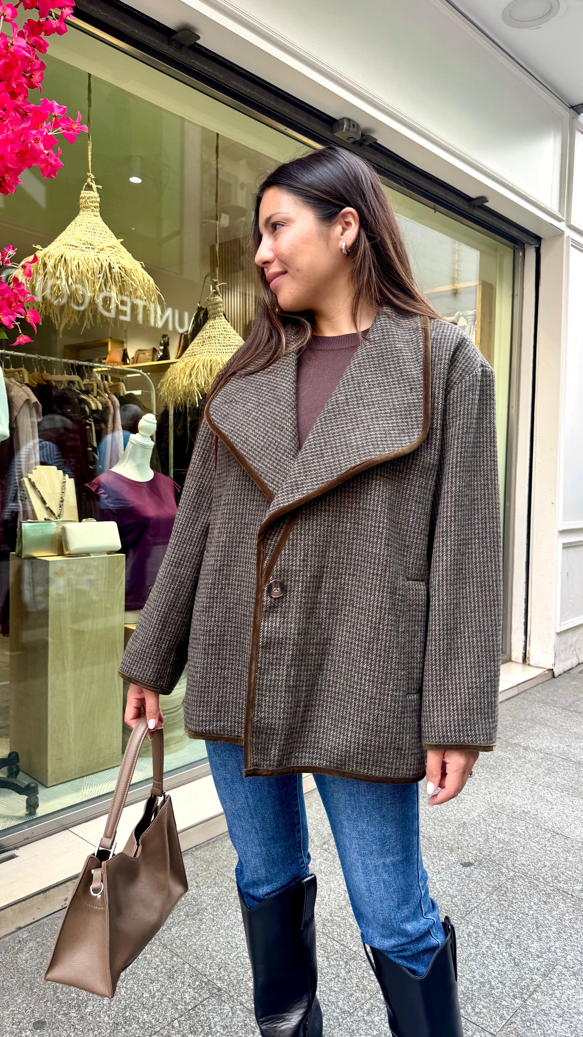 Abrigo de cuadros, ancho y con grandes solapas. En tonos caqui y marrón.