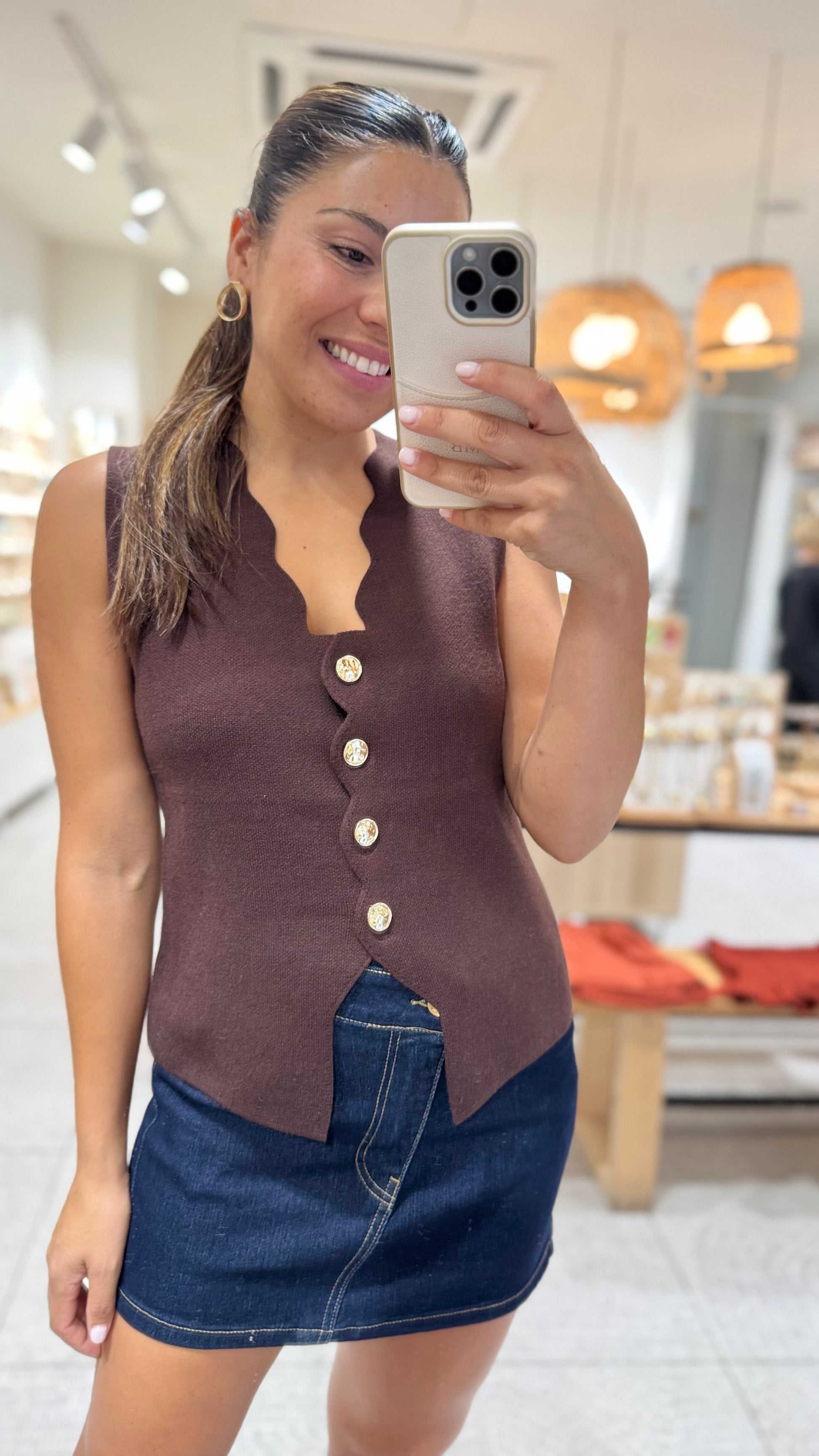 Chaleco con ondas y botones dorados.