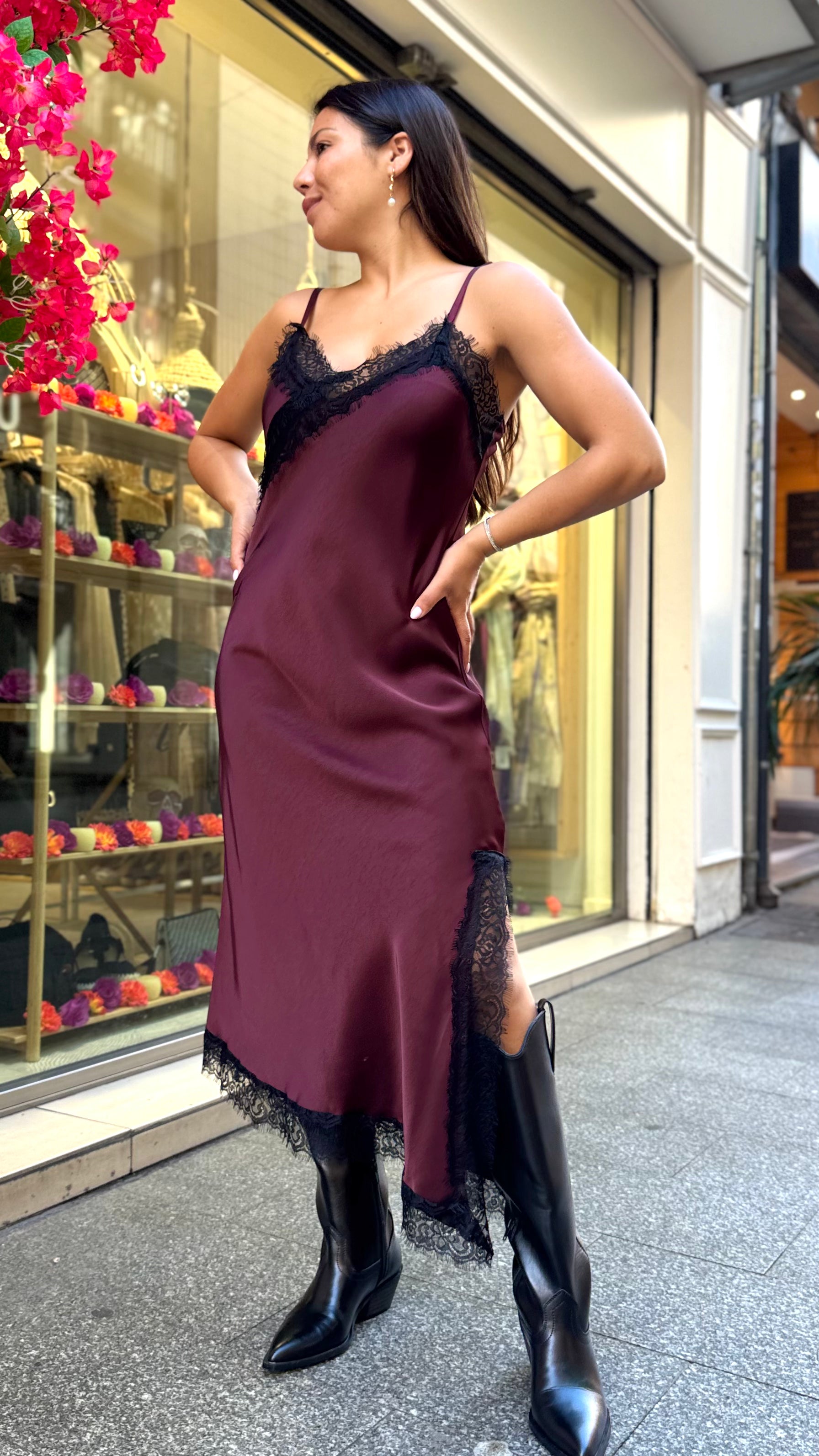 Vestido largo lencero, color vino con detalles en negro. Lo último en tendencias!